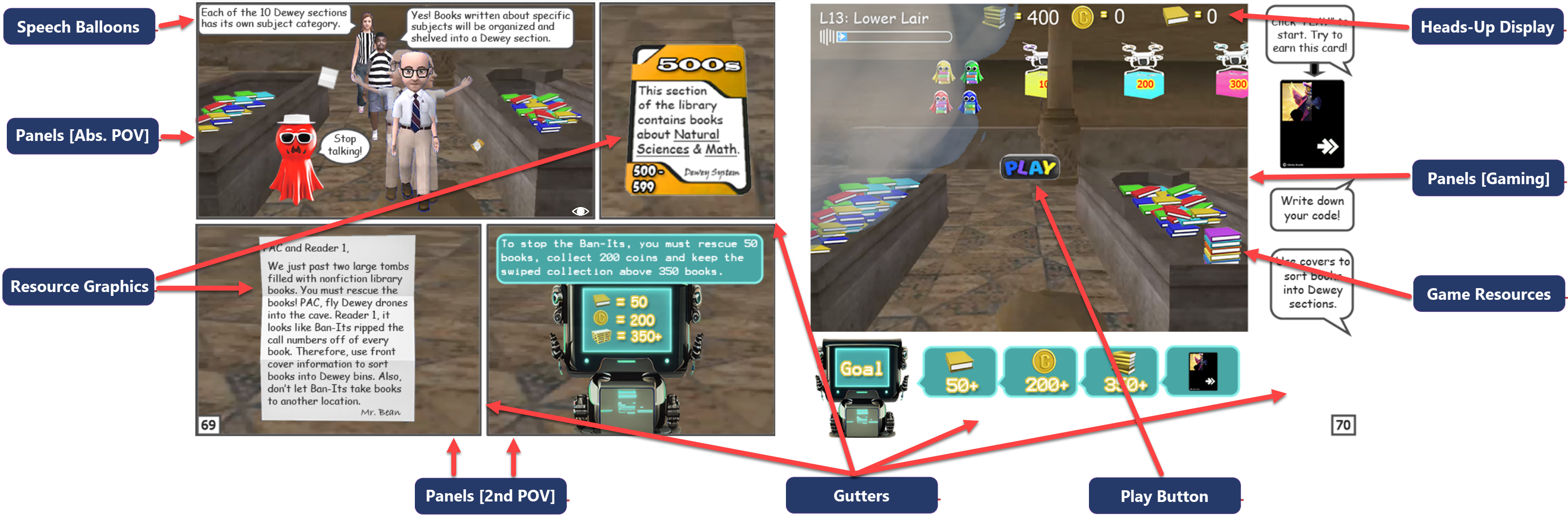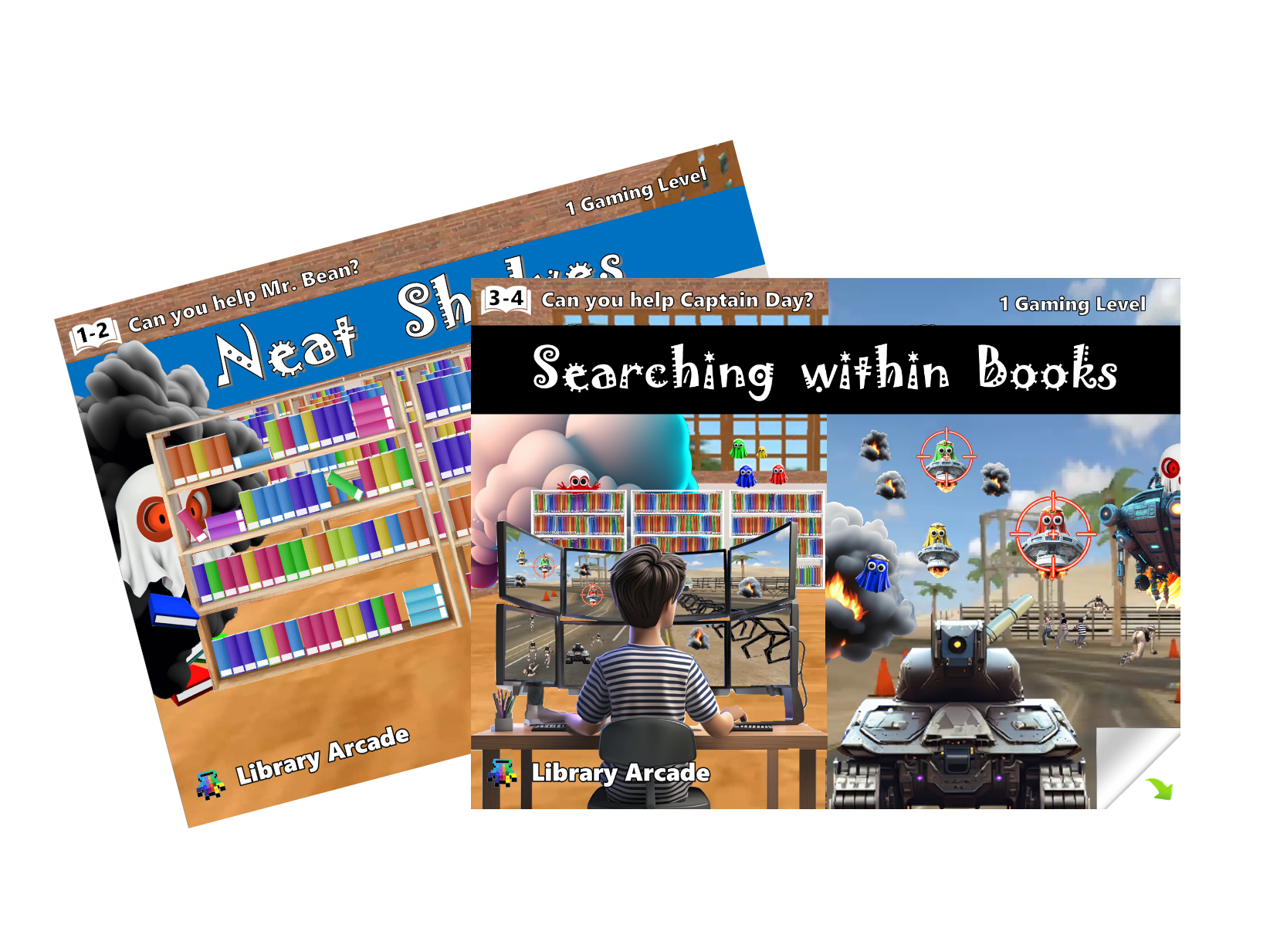 Third, students transition from Library Talk to Arcade Readers. Arcade Readers are activity books that exist right at the intersection of graphic novels and videogames. Arcade Readers feature graphic novel style illustrations and dialogue balloons that work together to explain library skills. Additionally, Arcade Readers have embedded, arcade-style learning games that provide fun, challenging and engaging environments to practice library and information skills.
